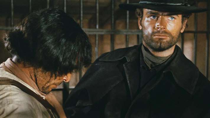 Вестерн начинается с крутейшей перестрелки между двумя бесстрашными парнями, готовыми порвать друг друга на клочки в этом вмиг обезлюдевшем, пустынном типичном городке американского Среднего Запада. Жители попрятались кто куда от страха за свою бренную жизнь. Но вдруг, откуда ни возьмись, между